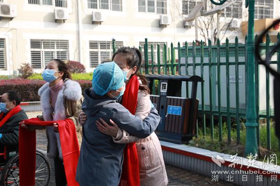 治愈出院患者與醫(yī)護(hù)人員擁抱。通訊員供圖