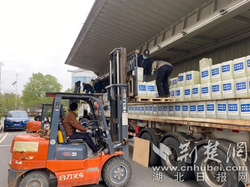 浙江巨化集團(tuán)捐贈(zèng)的消毒液運(yùn)抵黃石,受到黃石市住建局和黃石開發(fā)區(qū)領(lǐng)導(dǎo)的歡迎。通訊員供圖