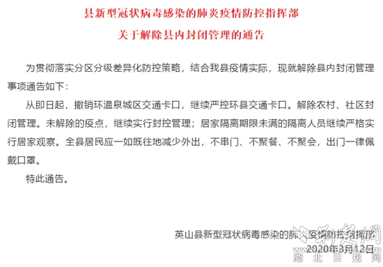 荊楚網(wǎng)客戶端—荊楚網(wǎng)消息(記者阮瓊 )3月12日,英山縣防控指揮部發(fā)布通告,為貫徹落實(shí)分區(qū)分級(jí)差異化防控策略,宣布從即日起,撤銷環(huán)溫泉城區(qū)交通卡口,繼續(xù)嚴(yán)控環(huán)縣交通卡口。解除農(nóng)村、社區(qū)封閉管理。未解除的疫點(diǎn),繼續(xù)實(shí)行封控管理;居家隔離期限未滿的隔離人員繼續(xù)嚴(yán)格實(shí)行居家觀察。全縣居民應(yīng)一如既往地減少外出,不串門、不聚餐、不聚會(huì),出門一律佩戴口罩。