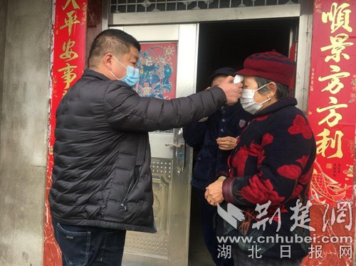 夏啟軍(左一)入戶測量體溫。通訊員供圖