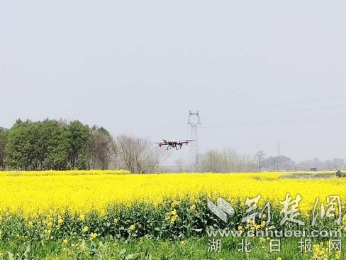 云淡風輕近午天,傍花隨柳過前川。3月14日上午12時許,華容區(qū)臨江鄉(xiāng)黃嶺村,金黃色的油菜花海,兩臺無人機如同辛勤的小蜜蜂,正在田間噴灑葉面肥,搶分奪秒。