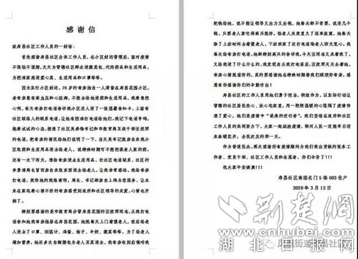 荊楚網(wǎng)客戶端—荊楚網(wǎng)消息(通訊員范先機(jī) 、高倩、李君)3月12,鄂州市福泉嘉源小區(qū)任立泉、邵蘭英兩位老人送給社區(qū)工作人員及市教育局包保干部的手寫的感謝信。同一天,南國(guó)名門小區(qū)一位78歲居民的女兒發(fā)送來電子感謝信。