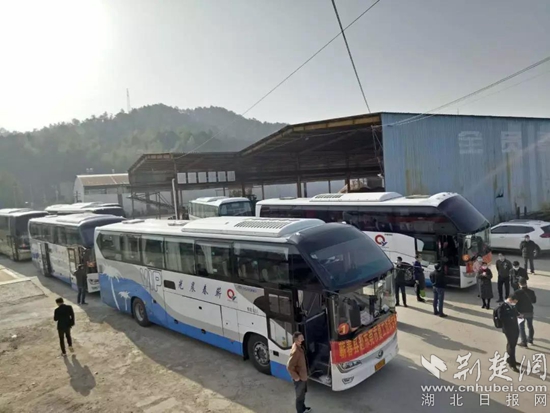 荊楚網客戶端—荊楚網消息(記者阮瓊)3月15日早上,10輛交通大巴??吭谔I春獅子鎮(zhèn)吳檀榜村,獅子鎮(zhèn)萬章、望江等村的268位農民工帶著行李,經過消毒、測量體溫、查驗身份證、健康碼、健康證明后有序上車,開始前往深圳、東莞等地復工。
