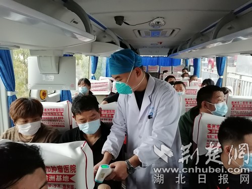 測(cè)體溫,集中乘車。通訊員供圖