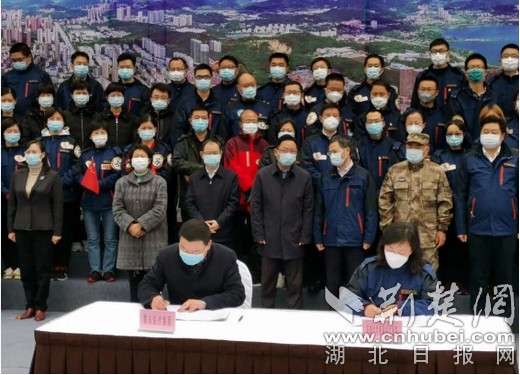 江蘇援湖北抗疫前方指揮部副總指揮、南京醫(yī)科大學(xué)副校長、南京醫(yī)科大學(xué)附屬逸夫醫(yī)院院長魯翔,與鄂東醫(yī)療集團總院長孫秋萍簽約。通訊員供圖