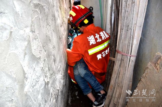 消防員到達現(xiàn)場后,發(fā)現(xiàn)小男孩頭部被卡在兩棟房子之間的墻縫內(nèi),嘴中不斷發(fā)出哭叫聲。見此情景,消防員一邊安撫小男孩,一邊迅速展開施救。
