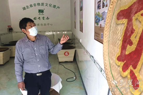 團(tuán)黃貢茶制作技藝傳承人徐柏云講解制茶工藝。(記者 胡小軍 攝)