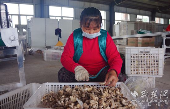 村民在扶貧大棚分揀食用菌。記者 胡小軍 攝