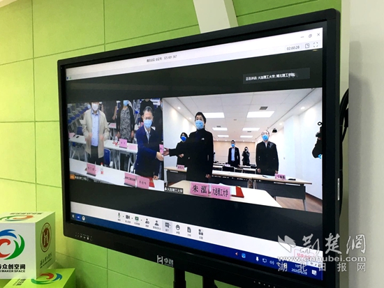 湖北理工學院副校長、創(chuàng)新創(chuàng)業(yè)學院院長尹念東(左)通過視頻連線,與大連理工大學副校長朱泓(右)隔空“云握手”。記者 呂鑒蕾 攝