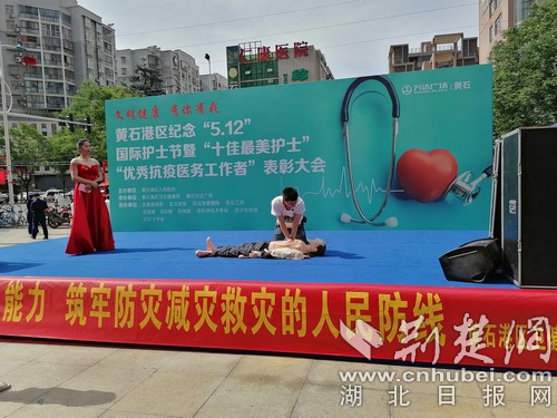 黃石港社區(qū)衛(wèi)生服務(wù)中心盧泳冰現(xiàn)場(chǎng)表演應(yīng)急救護(hù)《心肺復(fù)蘇》。通訊員供圖