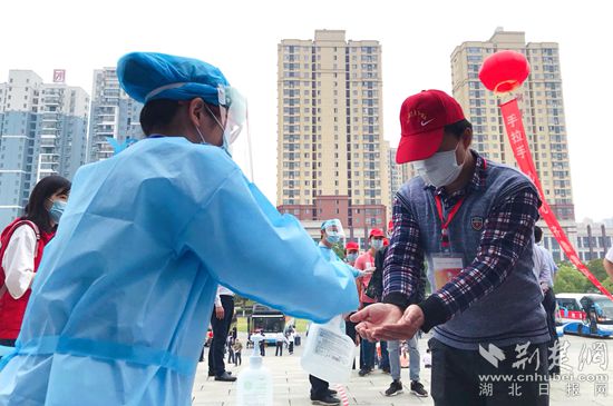 務工人員出發(fā)前進行測溫消毒。記者胡小軍攝
