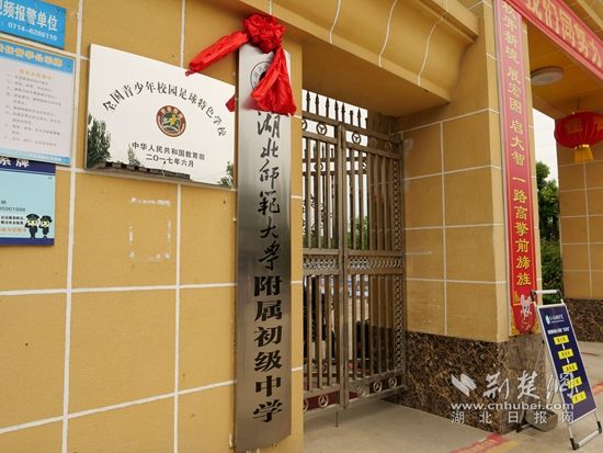 學(xué)校大門口已掛上“湖北師范大學(xué)附屬初級中學(xué)”牌匾。(石雋哲 攝)