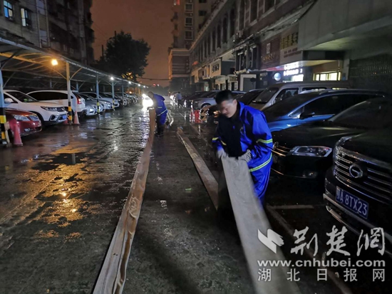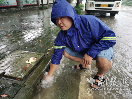 用沙袋筑堤、黃土堵水、設置警戒線、徒手清掏樹葉、撈起垃圾雜物……頭上暴雨如注,腳下水流湍急,在湖濱大道、黃石大道、月亮山隧道等積水路段,隨處可見搶疏搶排的身影。