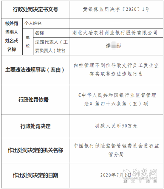 荊楚網(wǎng)客戶端—荊楚網(wǎng)消息(記者 呂鑒蕾)7月7日,中國銀保監(jiān)會湖北監(jiān)管局網(wǎng)站發(fā)布處罰公告稱,因內(nèi)控管理不到位導致支行員工發(fā)生空存實取等違法違規(guī)行為,湖北大冶農(nóng)村商業(yè)銀行股份有限公司(后文簡稱“大冶農(nóng)商行”)被罰50萬元。同日,中國銀保監(jiān)會湖北監(jiān)管局網(wǎng)站還公布了對7名責任人的行政處罰決定。其中,1名直接責任人被禁止終身從事銀行業(yè)工作。