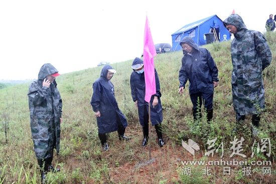 突擊隊(duì)員發(fā)現(xiàn)了堤壩上一處管涌,立即對此處作標(biāo)識處理。通訊員供圖