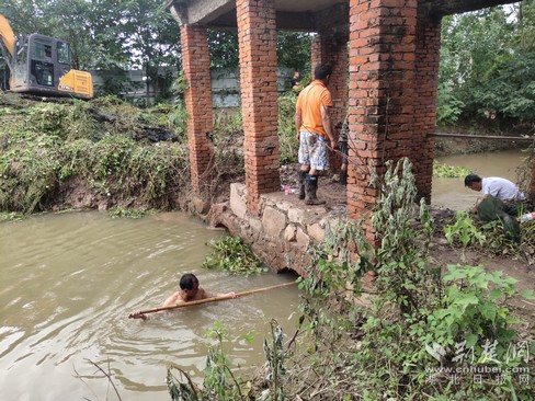 荊楚網客戶端—荊楚網消息(通訊員陳運章、葉倩)汛情來勢洶洶,鄂州多地內澇嚴重。面對涵洞堵塞無法正常排水,而挖機臂長不夠達不到清理效果的困局,為保群眾生命財產安全,鄂州東港村出現(xiàn)了感人的一幕:該村一村干部不顧個人危險,毅然跳入一人高的溝渠清除堵塞物。