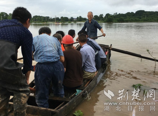 黃太忙劃船接防汛人員到湖堤對(duì)岸搶險(xiǎn)。(通訊員供圖)