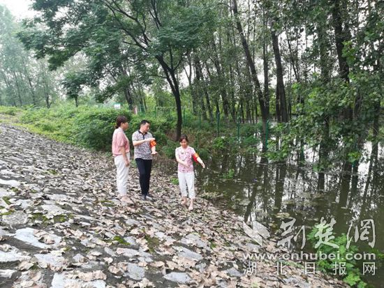 嚴慧君(右一)等人在湖堤巡查。(紡織社區(qū)供圖)