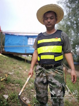 17日下午2時許,記者在鄂州市長江干堤燕磯段4號哨棚見到繆軍華,他身著迷彩服,戴著草帽,手握鐮刀,胸前別著黨徽,皮膚黝黑。由于長時間的睡眠不足,他眼圈耷拉著,嗓門也大,工作起來,虎虎生威。