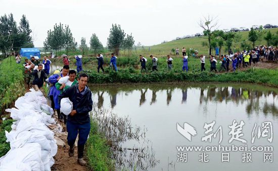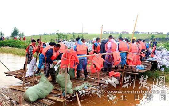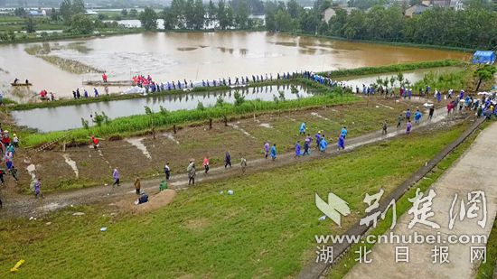 “一二、一二......”伴隨著整齊的口號,一群群應(yīng)急搶險隊員們組成人工“傳送帶”,將裝滿碎石的沙袋投進河底管涌處。烈日炎炎,赤東大堤堤腳,搶險隊員們用砂石裝袋,壘成一堵堵堅實的圍墻。