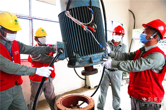 原200千伏安的變壓器被吊下配變臺(tái)架,新調(diào)來的315千伏安的變壓器平穩(wěn)地落座在配變臺(tái)架上……經(jīng)過近4個(gè)小時(shí)的安裝、調(diào)試,接通10千伏千畝湖支線等一系列的緊張工作。19時(shí)02分,2臺(tái)先期安裝好的55千瓦的水泵成功啟動(dòng),兩股水流沖出千畝湖,流向遠(yuǎn)方。