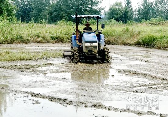 當天中午,程法村種糧大戶曹茂開頂著烈日忙著用拖拉機整(耕)田。眼看著飯點都已經過了,這個倔強的漢子全然沒有在意肚子在咕咕叫,非要把稻田耕好。