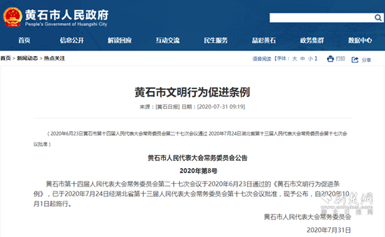 黃石市人大常委會(huì)發(fā)布《黃石市文明行為促進(jìn)條例》公告。(來源:黃石市政府網(wǎng))