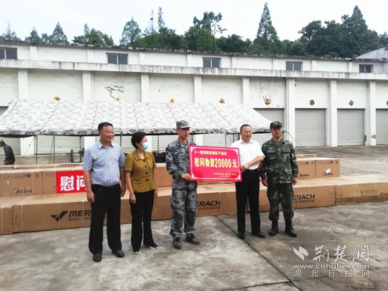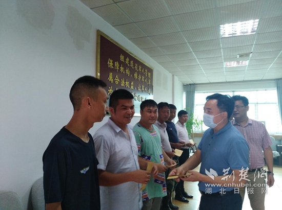 7月29日,黃石市退役軍人事務(wù)局黨組書記、局長胡長春慰問陽新縣退役軍人防汛志愿突擊隊隊員。(通訊員供圖)