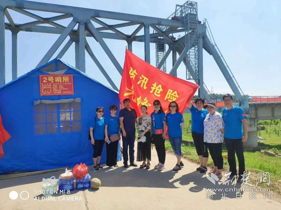 “八一屆”空軍退役女兵們頂著烈日、冒著酷暑來到長江堤壩慰問正在防汛值守的退役軍人,為他們送去礦泉水、回族餅、哈密瓜等物資。(通訊員供圖)