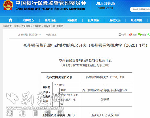 荊楚網(wǎng)客戶端—荊楚網(wǎng)消息(記者 王焱堯)8月19日,中國銀行保險監(jiān)督管理委員會公開發(fā)布對鄂州農(nóng)村商業(yè)銀行股份有限公司行政處罰決定,對該行違規(guī)向關(guān)聯(lián)方發(fā)放貸款行為進行了處罰,罰款25萬元。