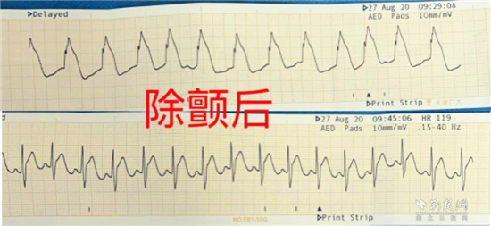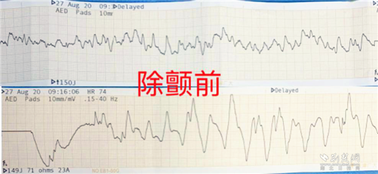 洪蒼浩為患者行徒手心肺復蘇后,經再次判斷,患者仍意識喪失、無頸動脈搏動,嘆氣樣呼吸、瞳孔散大。急診科醫(yī)生姜新昌、護士楊文婷也趕到現(xiàn)場。三人協(xié)同將患者轉到急診科搶救室,搶救過程中心電監(jiān)護顯示為“室顫”。