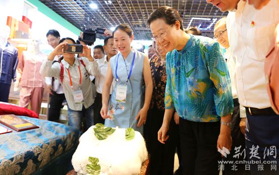 第二屆“一節(jié)一會(huì)”上,黃岡市委副書(shū)記、市長(zhǎng)邱麗新與嘉賓們聽(tīng)取參展人員介紹產(chǎn)品。 記者 胡小軍攝