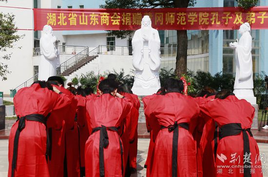 荊楚網(wǎng)客戶端-荊楚網(wǎng)消息(記者胡小軍 通訊員余艷軍、劉細(xì)松)9月28日是孔子誕辰2571周年紀(jì)念日,黃岡師范學(xué)院舉行孔子及弟子群雕揭幕儀式。