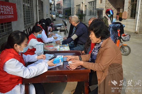 義診現場,醫(yī)務人員擺起長桌幫老人進行健康體檢,并提供相關診療服務,給病患送藥。同時,醫(yī)務人員與老人進行家庭醫(yī)生簽約,給老人發(fā)放健康宣傳資料,并為老人講解健康生活方式、慢性病以及新冠肺炎防治等知識,傳授家庭急救小秘方。