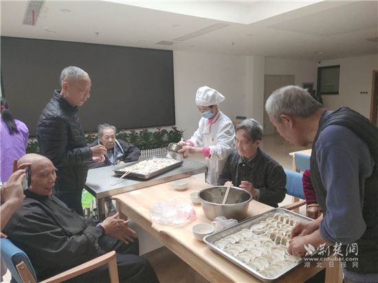 養(yǎng)護(hù)院內(nèi)的老人們圍坐在一起其樂(lè)融融的包餃子。熊子璇 攝