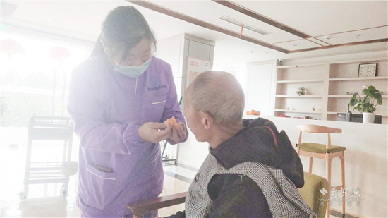 護(hù)理員胡科喂阮爺爺吃桔子。熊子璇 攝