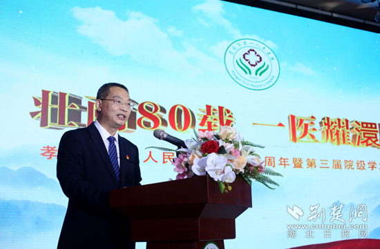 該院黨委書記、院長楊鵬鳴在致辭中回顧:1940年,抗日戰(zhàn)爭如火如荼進行,八路軍、新四軍與日寇浴血奮戰(zhàn)。為解決戰(zhàn)時傷病員救護問題,當(dāng)年11月8日,新四軍在孝感城內(nèi)西門彭家巷設(shè)立了一個傷員救護點,這個戰(zhàn)時救護小診所便是孝感市第一人民醫(yī)院的前身。