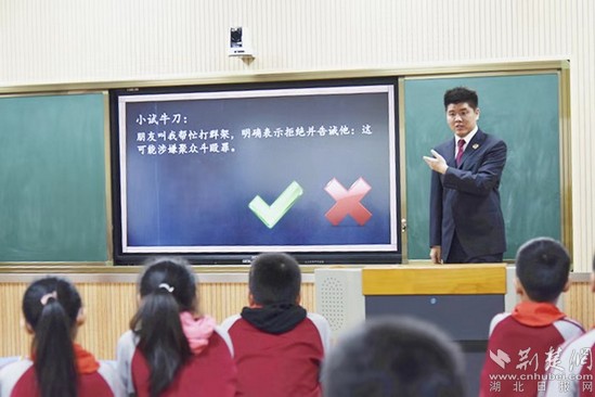 荊楚網(wǎng)客戶端—荊楚網(wǎng)消息(通訊員 李抒陽)11月10日上午,黃石市下陸區(qū)人民檢察院聯(lián)合團(tuán)市委、市檢察院前往張家湖小學(xué),為該校四年級(jí)學(xué)生講了一堂頗有趣味的法治教育課。下陸區(qū)檢察院干警張文豪擔(dān)任主講人。