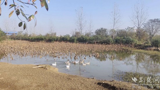 在基地魚(yú)塘內(nèi)養(yǎng)的鵝。記者 熊子璇 攝