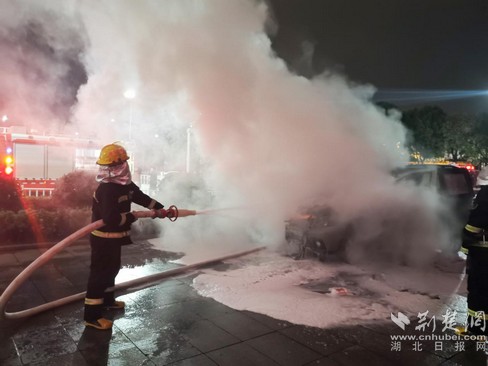 當晚21時48分,鄂州市消防救援支隊接到報警稱,位于鄂城區(qū)濱湖北路艷陽天酒店門口一輛汽車著火。接到報警后,鄂州消防立即調(diào)派力量趕赴現(xiàn)場處置。