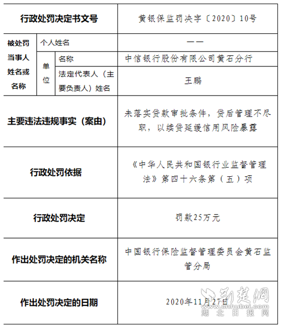 公告稱(chēng),中信銀行黃石分行因未落實(shí)貸款審批條件,貸后管理不盡職,以續(xù)貸延緩信用風(fēng)險(xiǎn)暴露的違規(guī)行為,依據(jù)《中華人民共和國(guó)銀行業(yè)監(jiān)督管理法》第四十六條第(五)項(xiàng),中信銀行黃石分行對(duì)其作出罰款人民幣25萬(wàn)元的行政處罰決定。