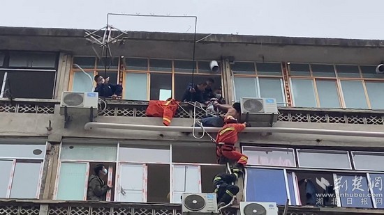 消防員來(lái)到5樓后,發(fā)現(xiàn)被困男子上身赤裸懸在空中,雙腳輕踩在5樓陽(yáng)臺(tái)窗戶一處狹窄橫梁上輕微搖晃。當(dāng)時(shí)室外氣溫僅2度,被困男子一只手牢牢抓住空調(diào)外機(jī)支架不愿接受救援,在寒風(fēng)中凍得渾身發(fā)抖,救援現(xiàn)場(chǎng)陷入僵局。