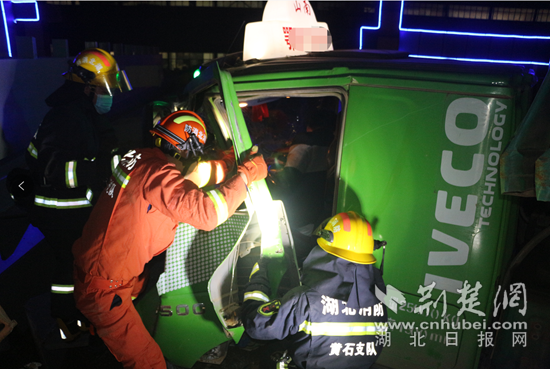 當(dāng)晚23時許,黃石市消防救援支隊(duì)幸福消防救援站接到報(bào)警:黃石市下陸區(qū)老下陸街十五冶一公司路段兩貨車相撞,一名駕駛員被困,現(xiàn)場情況十分危急。收到求援后,救援站立即出動兩輛消防車以及10名消防員前往事故現(xiàn)場處置。