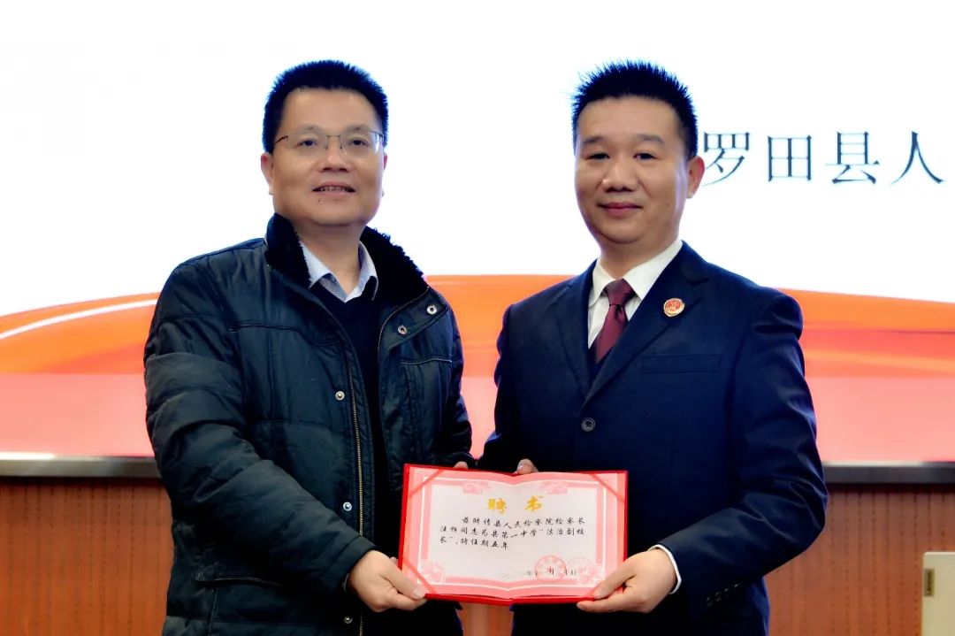 羅田縣教育局黨組書記、局長葉從飛為汪輝頒發(fā)法治副校長聘書