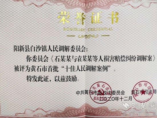 白沙鎮(zhèn)人民調(diào)解委員會報送的《石某某與袁某某等人損害賠償糾紛調(diào)解案》獲黃石市首批“十佳人民調(diào)解案例”。通訊員供圖