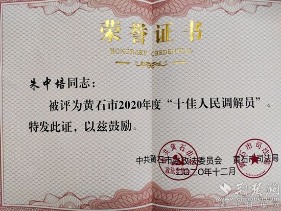 朱中培獲黃石市2020年度“十佳人民調(diào)解員”榮譽(yù)稱號。通訊員供圖