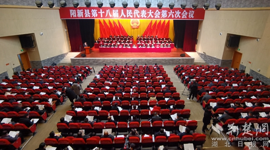 陽(yáng)新縣第十八屆人民代表大會(huì)第六次會(huì)議現(xiàn)場(chǎng)。(記者阮瓊 制作)