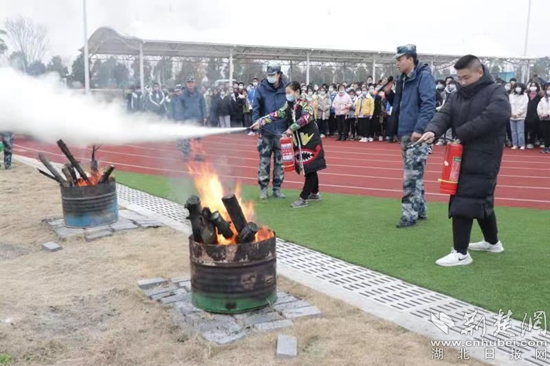 同學(xué)們?cè)诮坦僦笇?dǎo)下認(rèn)真開展消防演練。(通訊員供圖)