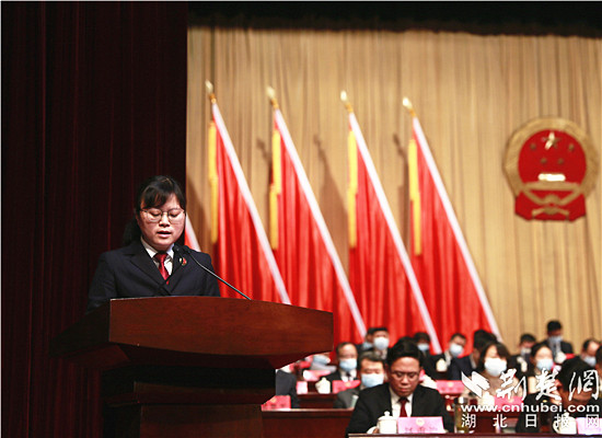 黃石市人民檢察院檢察長梁莉作《黃石市人民檢察院工作報告》。金康 攝