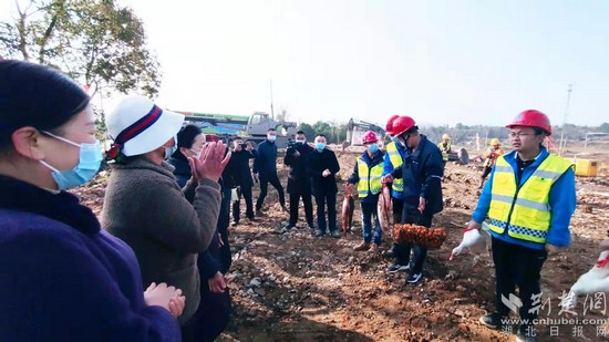 荊楚網(wǎng)客戶端—荊楚網(wǎng)消息(記者熊子璇 通訊員李彥培)2月9日,鄂州市花湖鎮(zhèn)村民自發(fā)扛著十幾筐鄂州特色美食,來到鄂州花湖機(jī)場施工現(xiàn)場慰問。